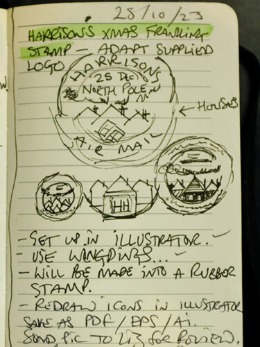 As usual, I write and sketch my initial ideas before moving onto Adobe Illustrator to render the design. A page from my ideas booklet is below: