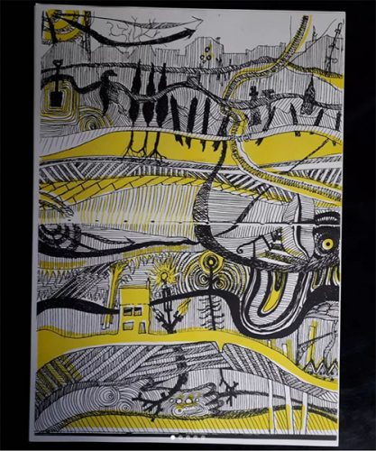 The course allow a maximum of two colours. As the artwork was created in pen and ink (black) it seemed like the right idea to keep it that way. The print run was a set of 10 prints, firstly in black ink, and then a second colour – I chose yellow. A stencil was made on tracing paper. I placed the tracing paper over the artwork and marked the areas where I wanted the second colour to sit.